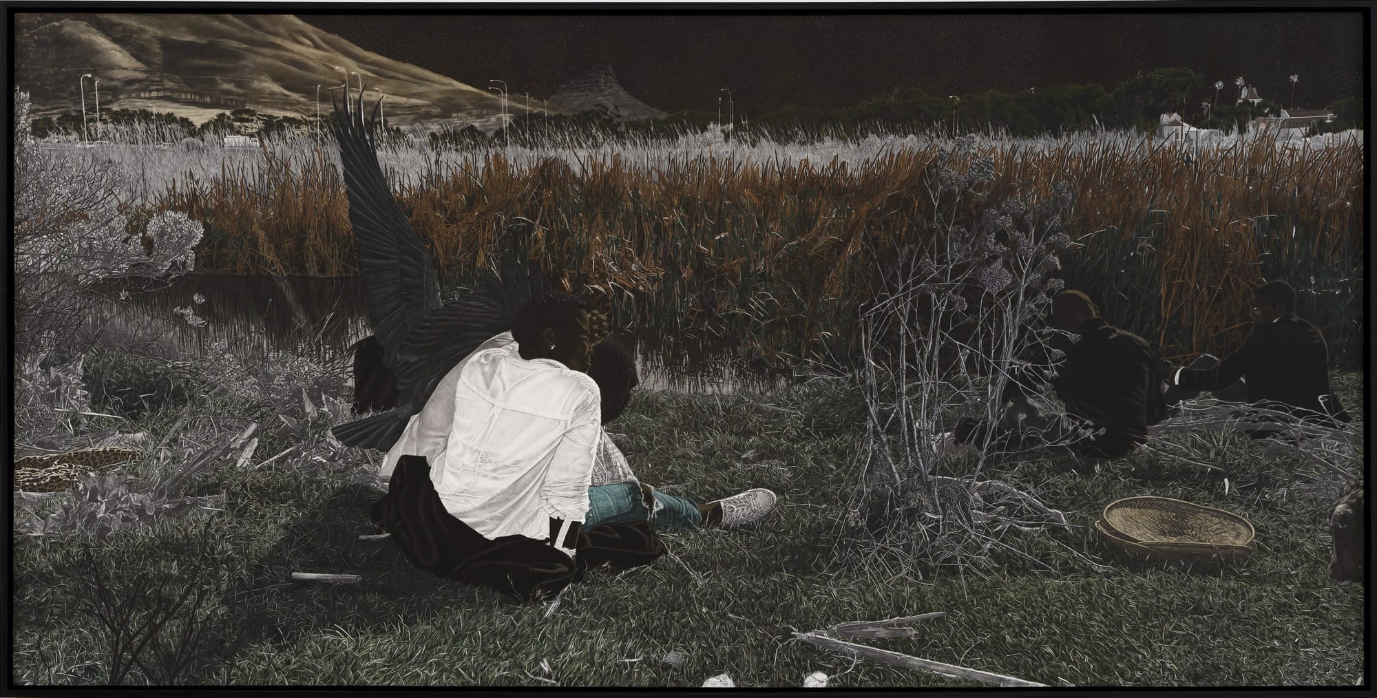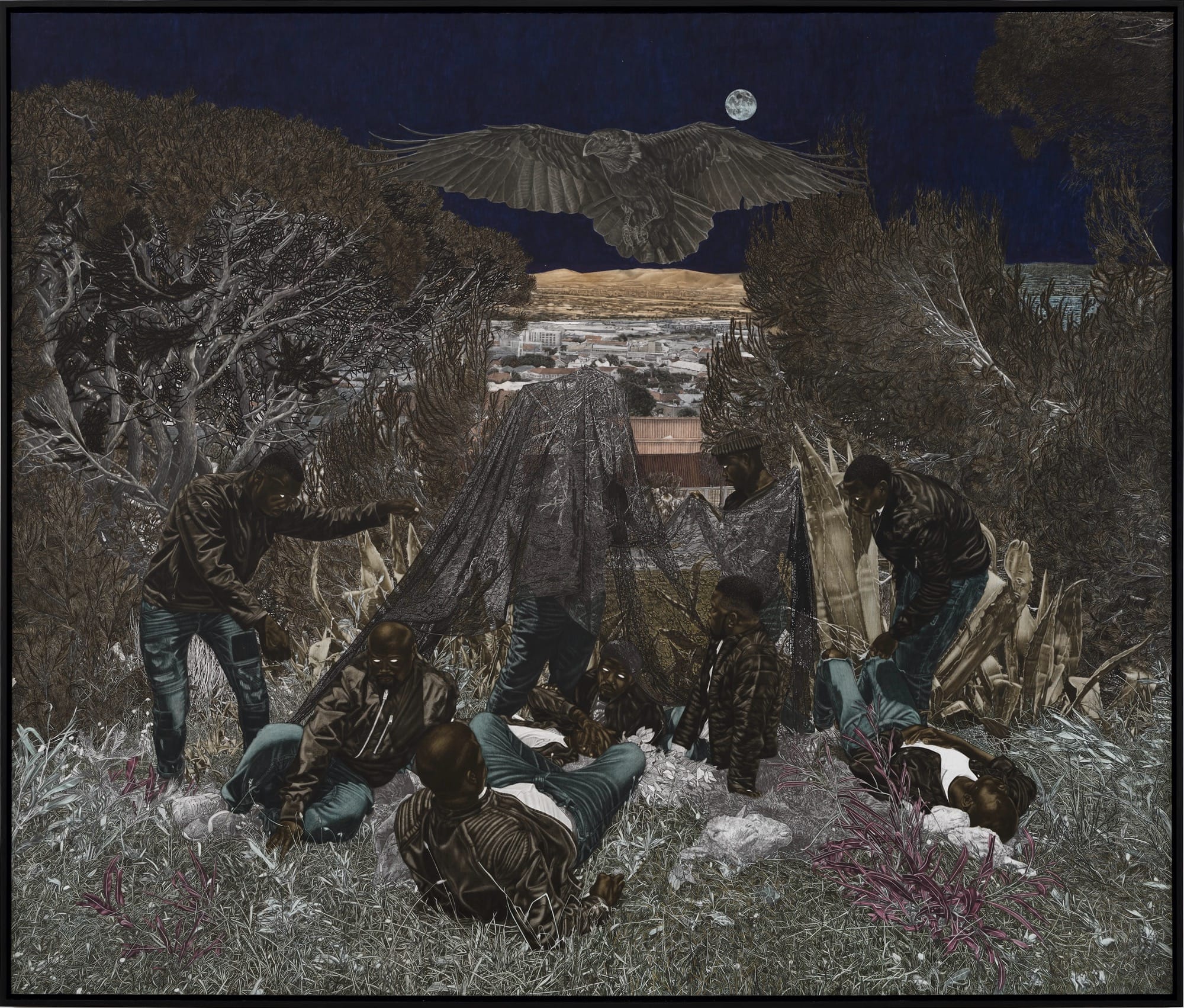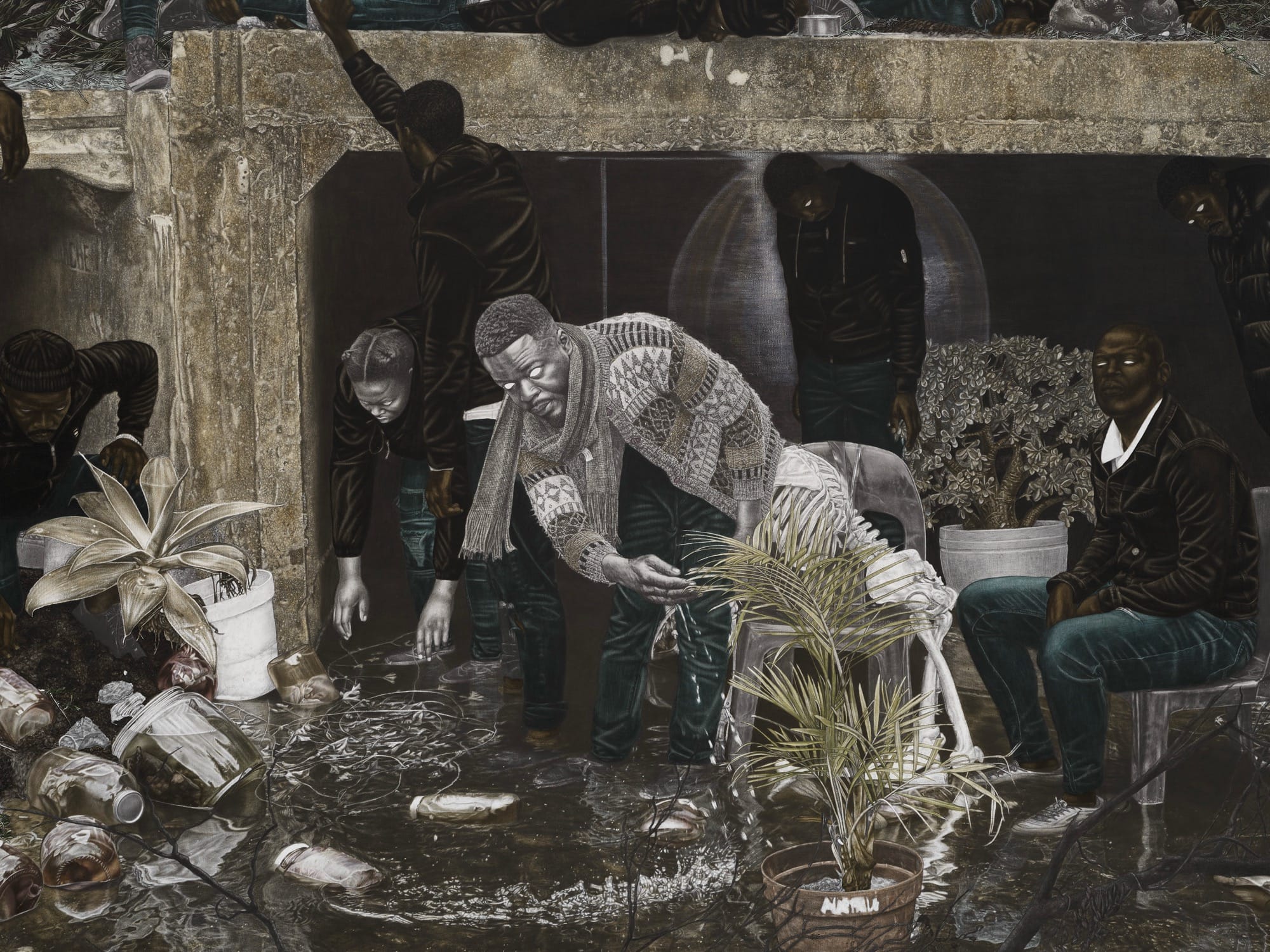Amid groves of trees, meadows, and aging infrastructure, Cinga Samson’s dreamlike tableaux are bathed in eerie light, as if spotlit or illuminated by the moon. The South African artist is known for his use of deep, dark pigments such as carbon black and Prussian blue, complemented by the occasional teal or purple and pops of bright white in t-shirts or sneakers. His figures, engaged in enigmatic activities, look on with spectral, all-white eyes. Green and brown foliage camouflages individuals who gather in fields, sort through mysterious items, and appear to converge with other beings like large birds.
