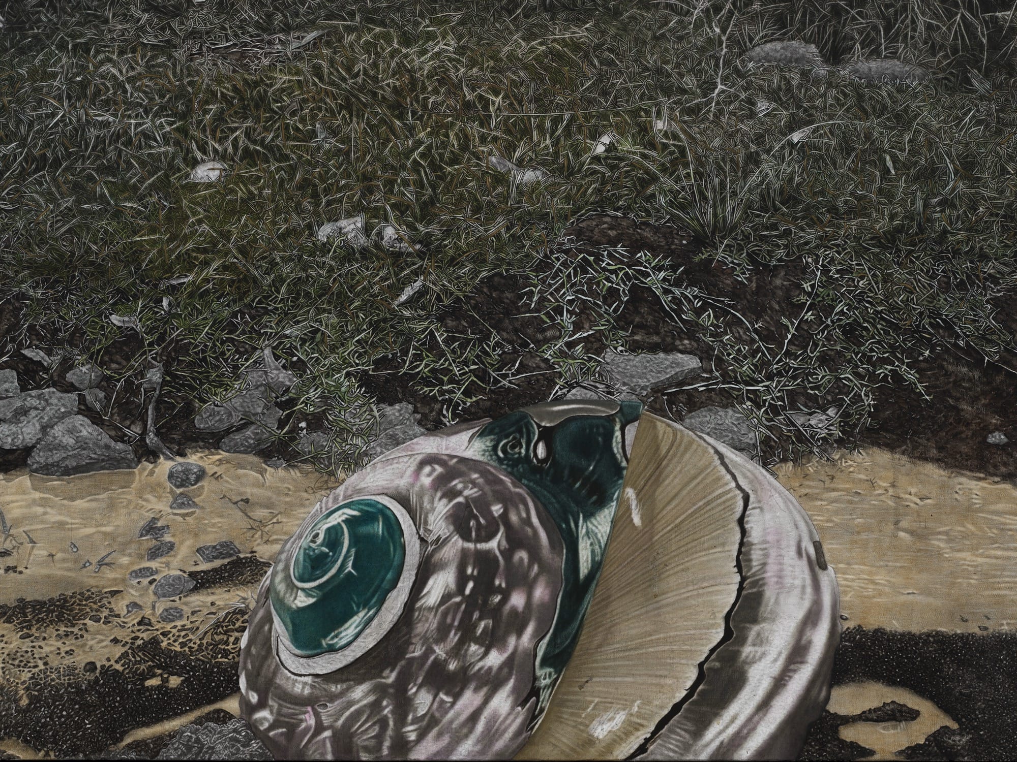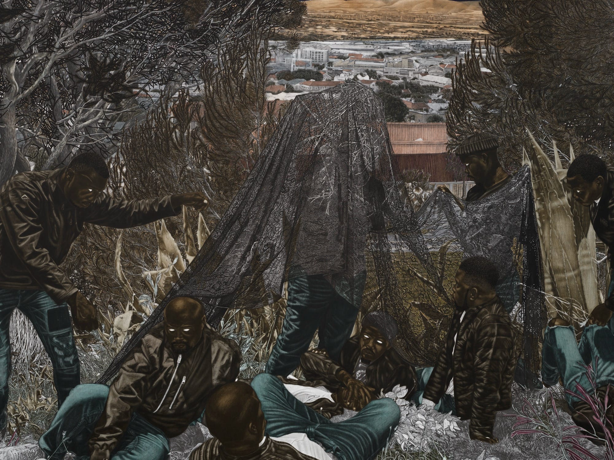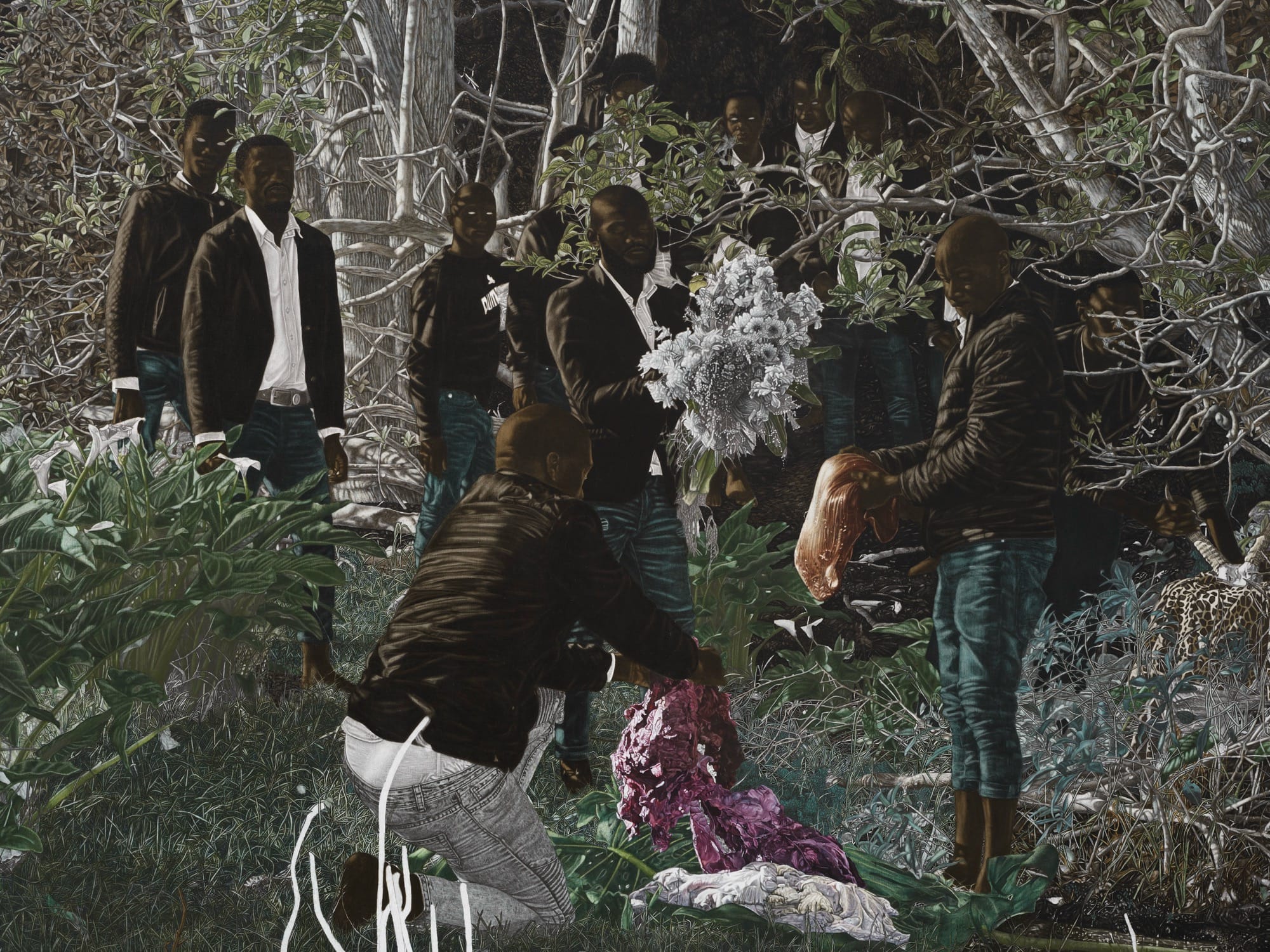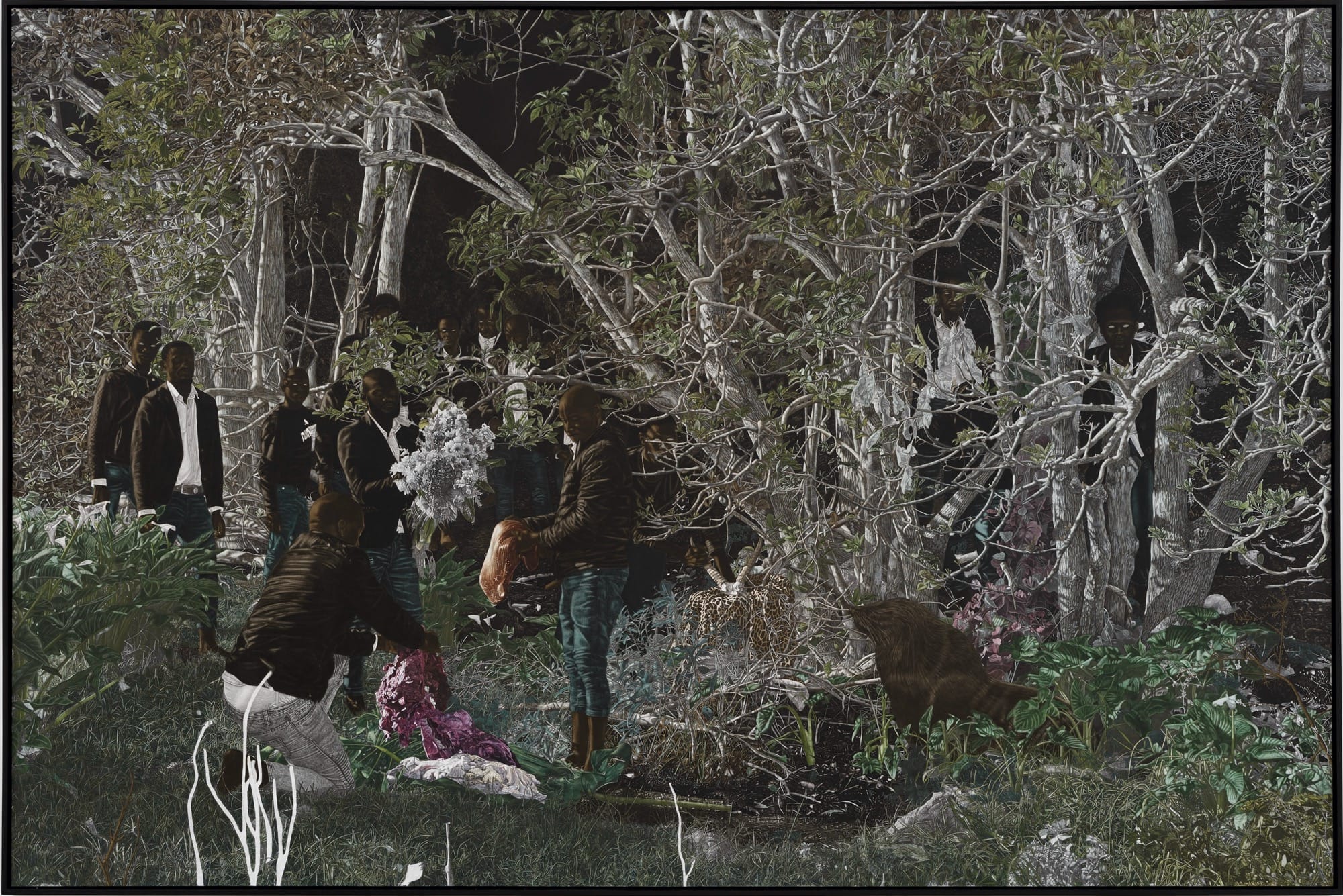 Amid groves of trees, meadows, and aging infrastructure, Cinga Samson’s dreamlike tableaux are bathed in eerie light, as if spotlit or illuminated by the moon. The South African artist is known for his use of deep, dark pigments such as carbon black and Prussian blue, complemented by the occasional teal or purple and pops of bright white in t-shirts or sneakers. His figures, engaged in enigmatic activities, look on with spectral, all-white eyes. Green and brown foliage camouflages individuals who gather in fields, sort through mysterious items, and appear to converge with other beings like large birds.