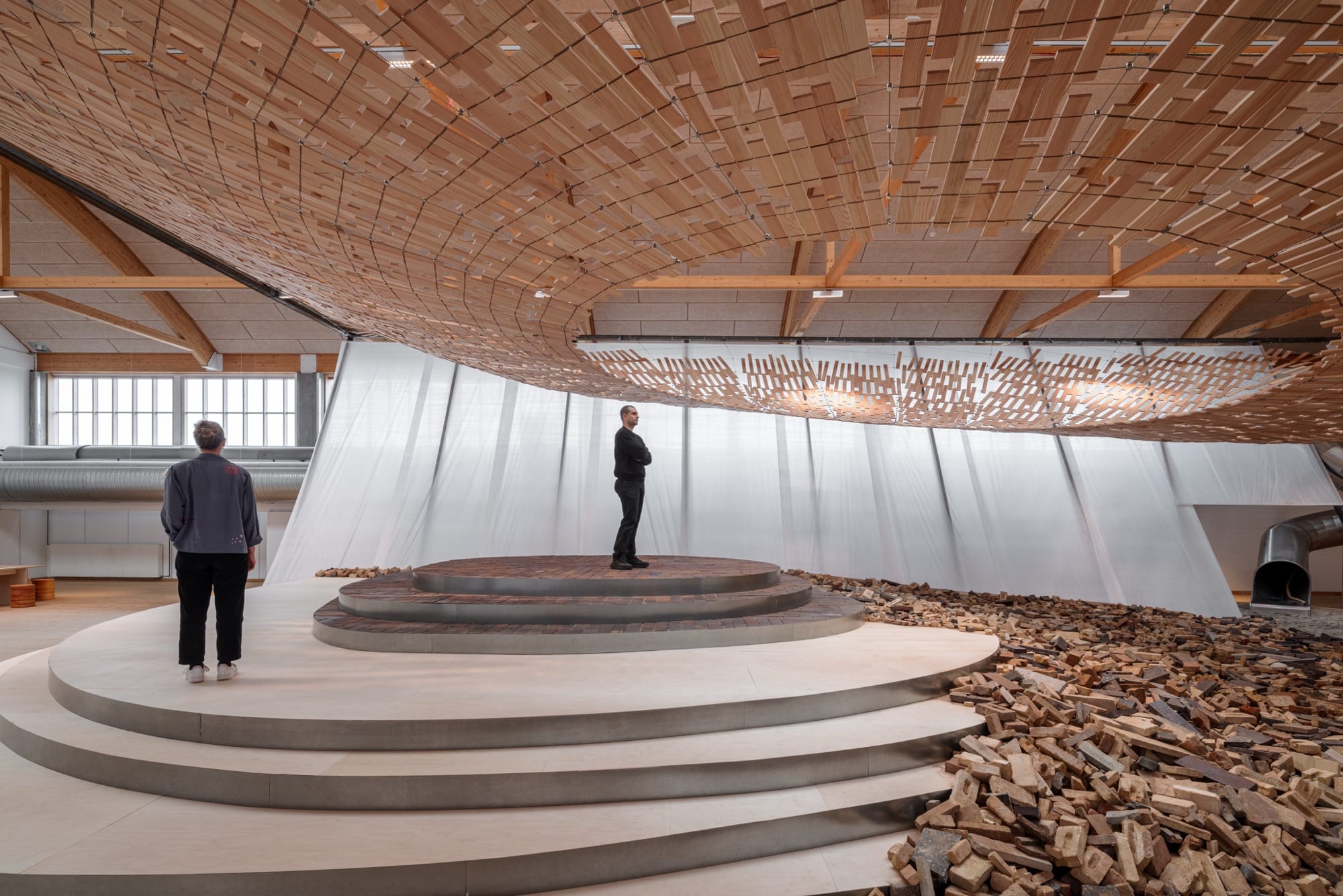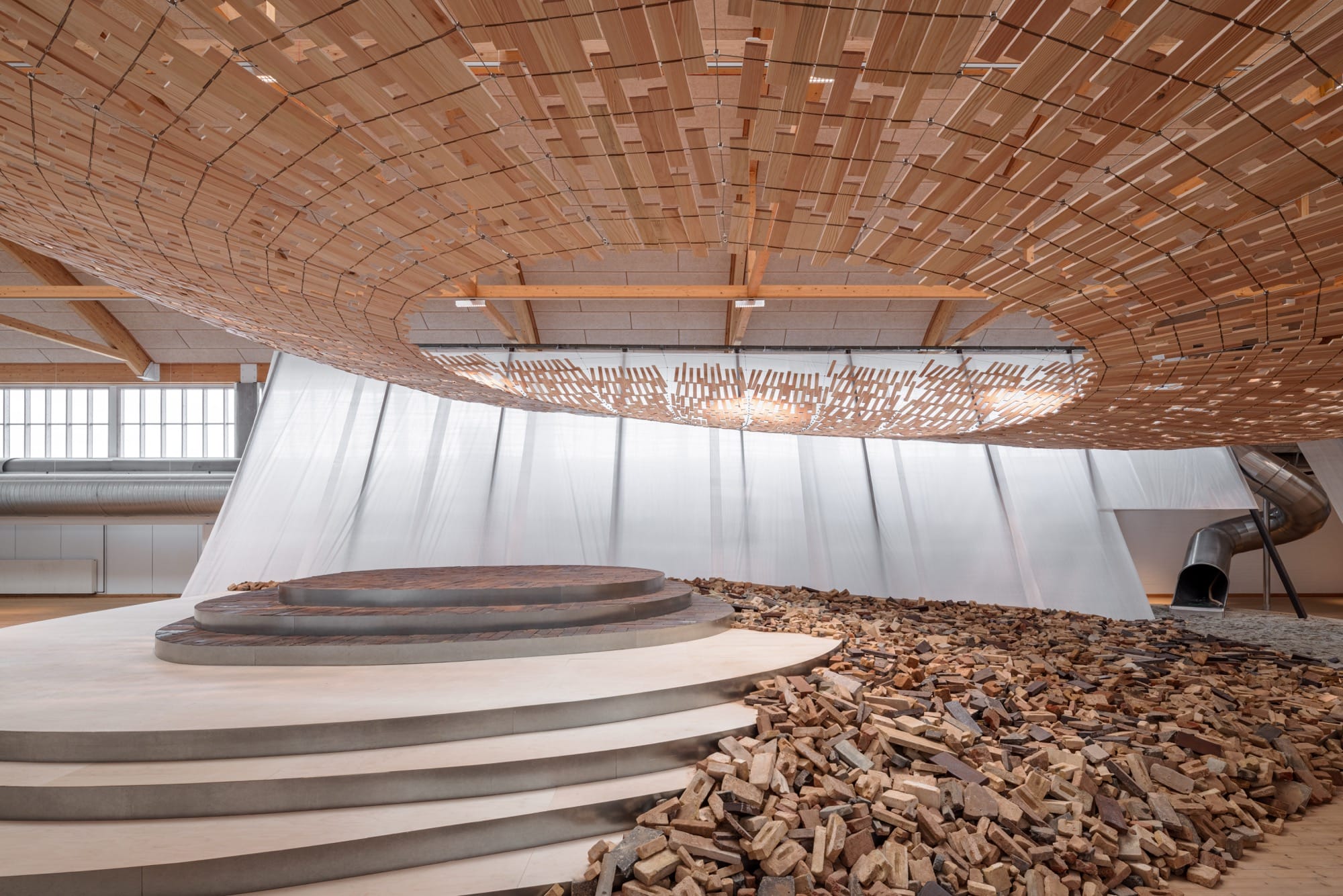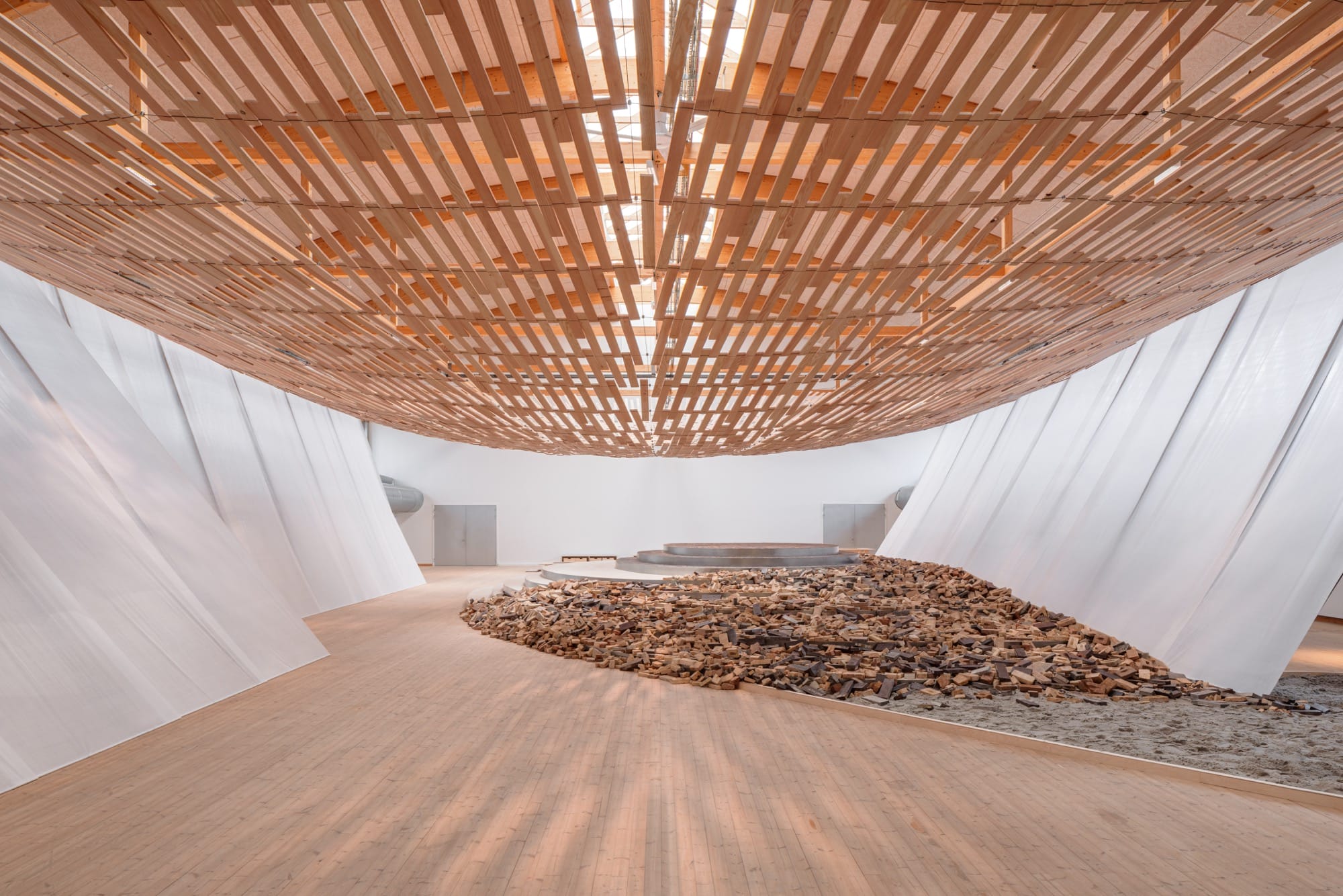 Curved with a central opening, the diaphonous structure floats above a brick platform and a pile of rubble. These two organic materials bridge Nordic and Japanese cultures, which both value craftsmanship and continuity with the landscape.