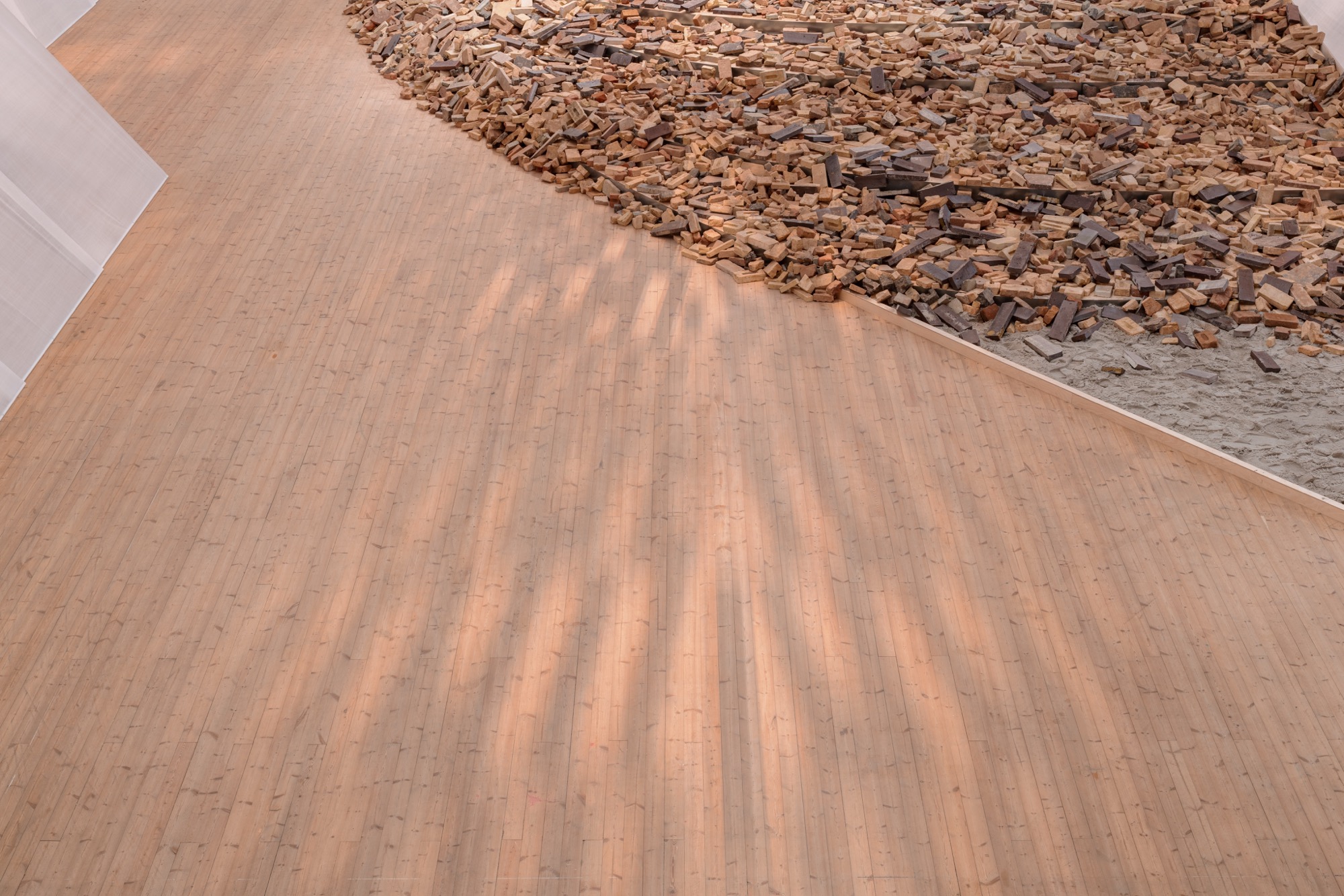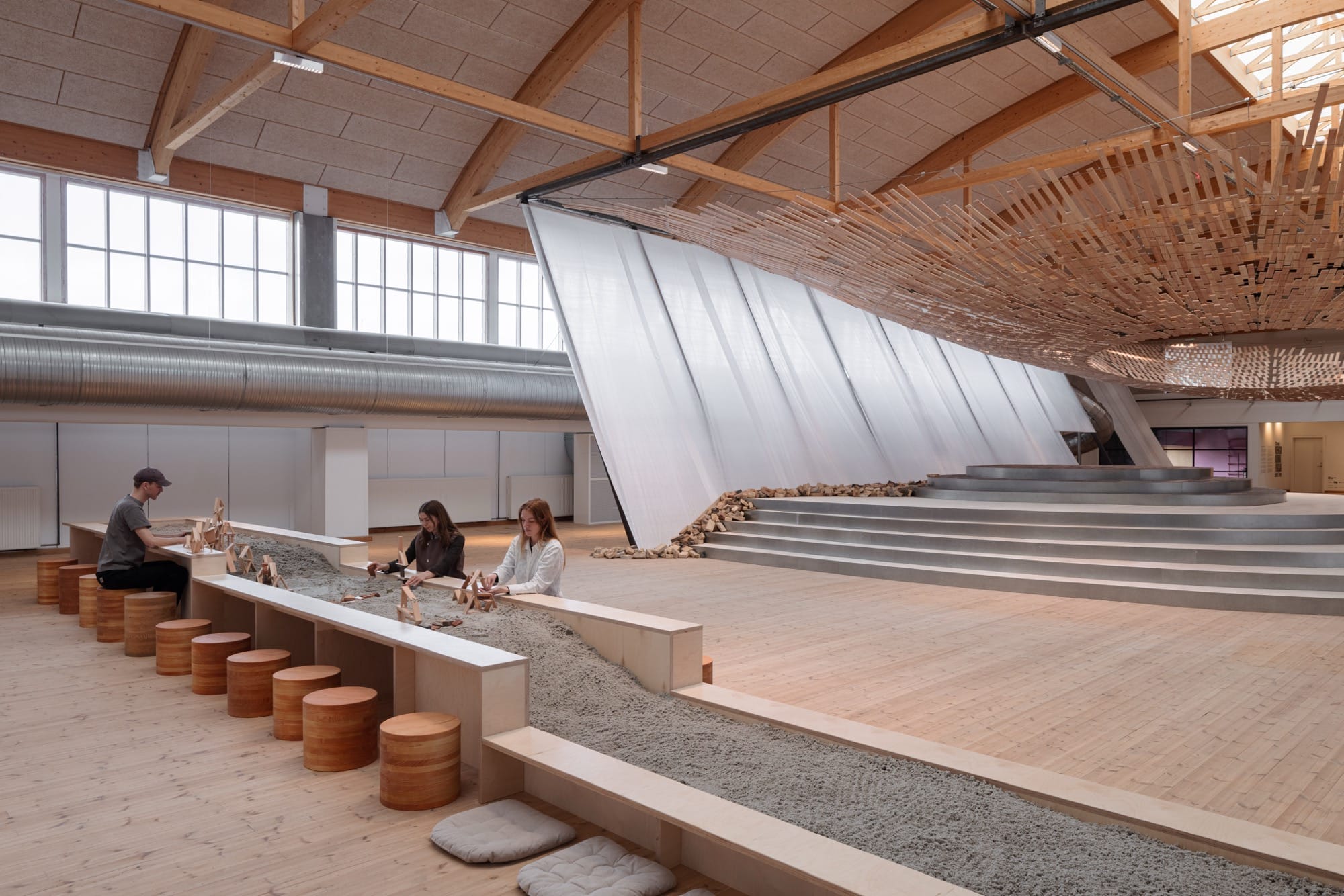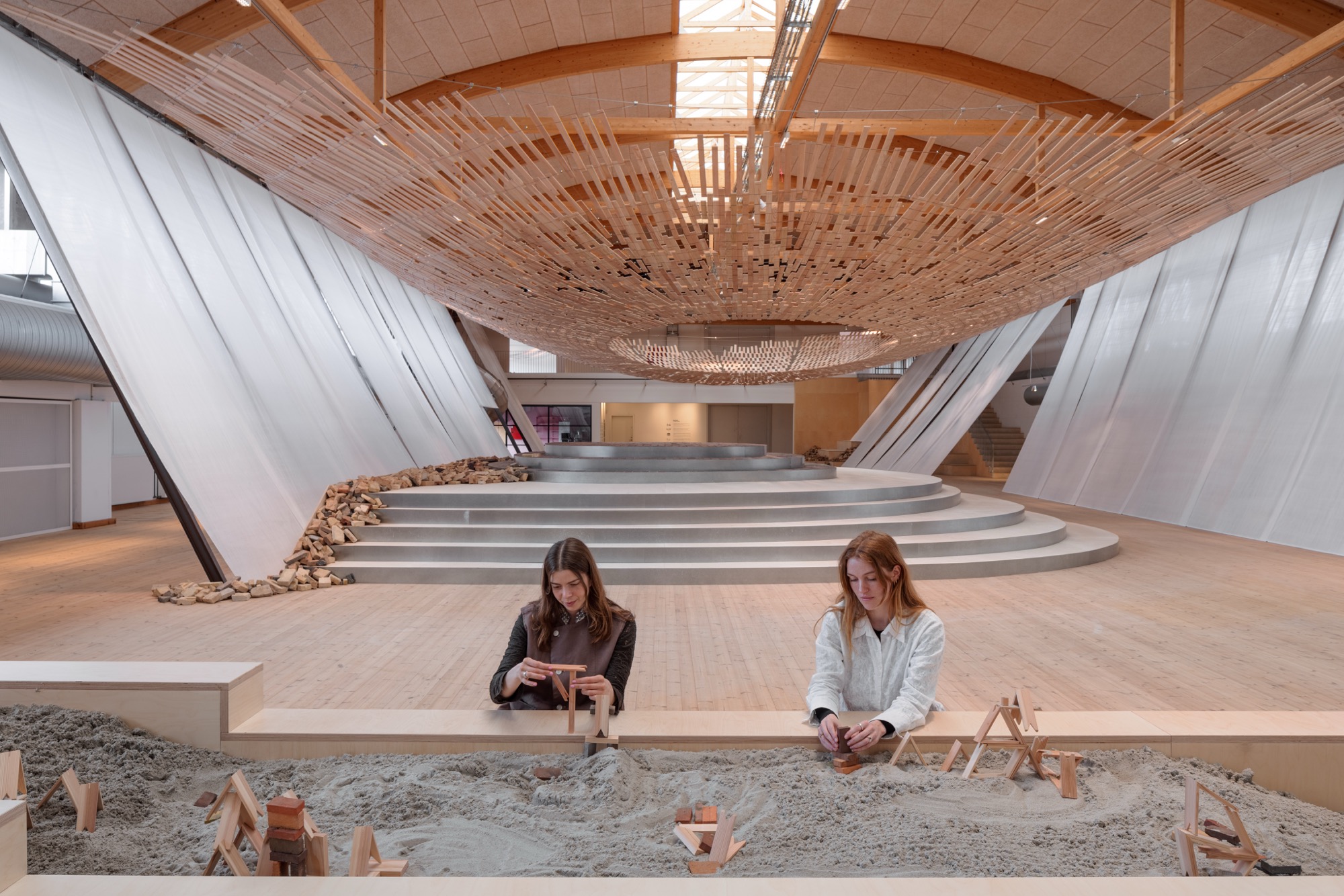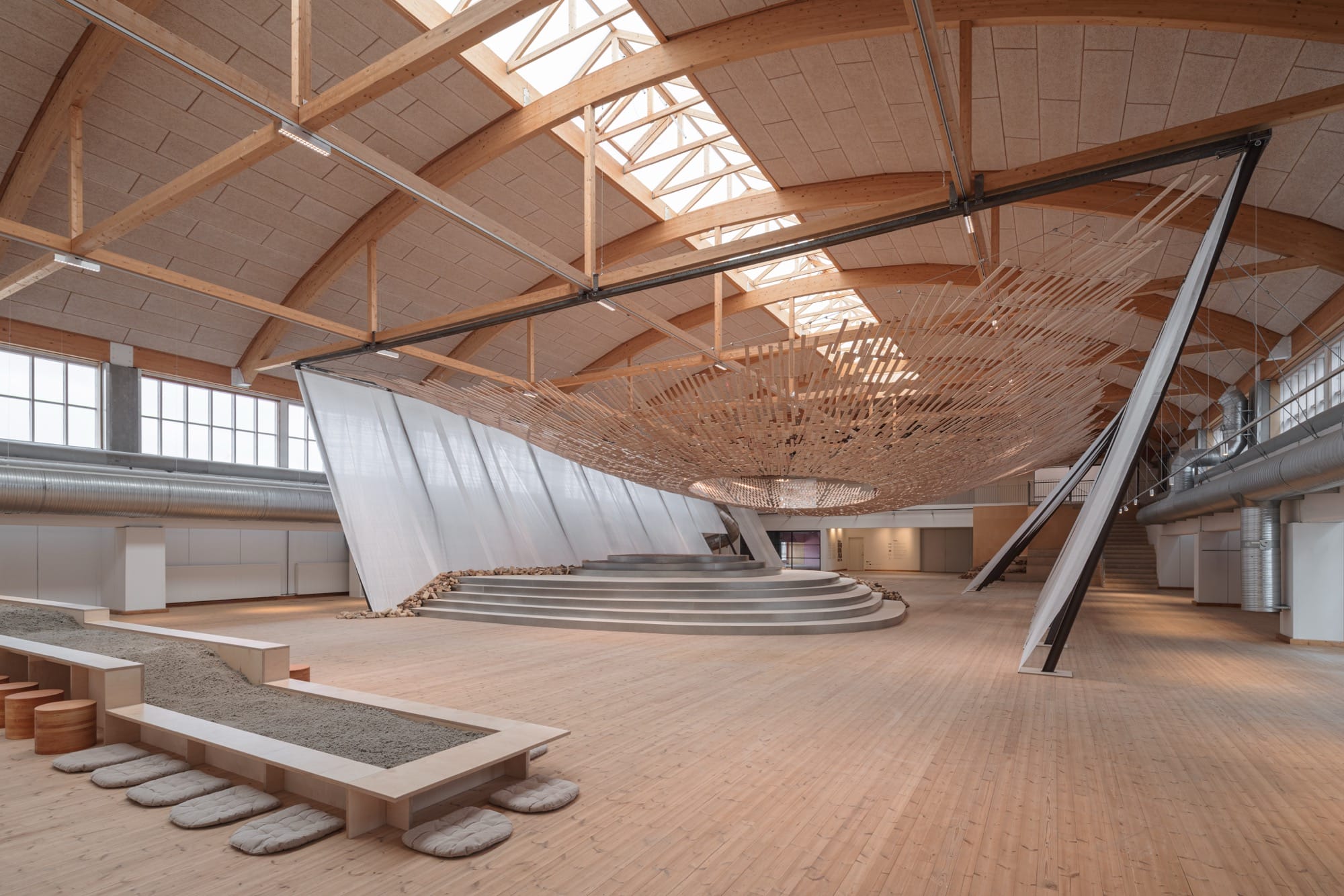 Curved with a central opening, the diaphonous structure floats above a brick platform and a pile of rubble. These two organic materials bridge Nordic and Japanese cultures, which both value craftsmanship and continuity with the landscape.