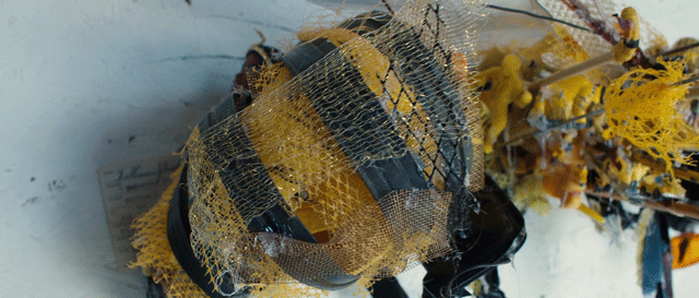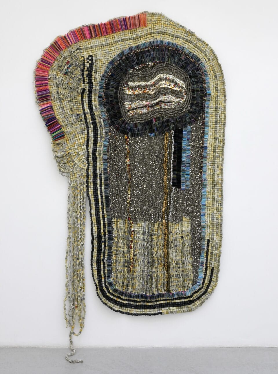 Takadiwa’s compositions drape, tapestry-like, with repetitive patterns and textures that alternate between softness and brittleness. From the distance, the details of unique components blur into a fabric-like substrate, but upon closer inspection, nail polish brushes, caps, and keyboard keys in various states of aged yellowing emerge as individual tributes to overconsumption and excess. “The result is beautiful, which is where the trouble begins,” Brenner writes. She continues: