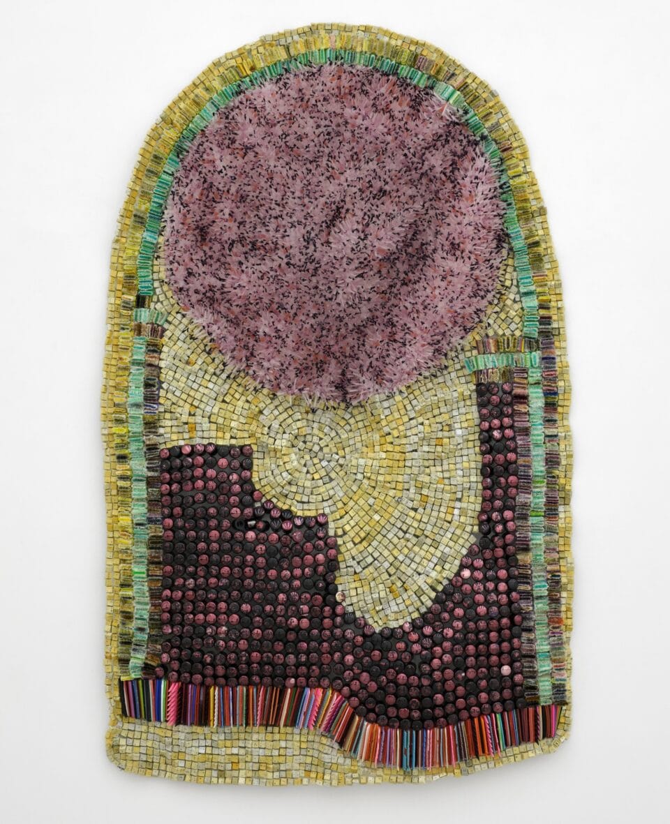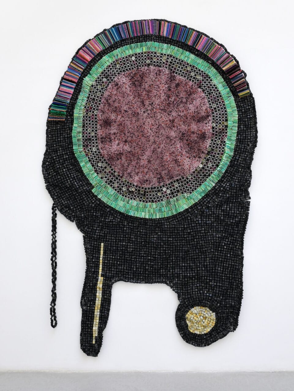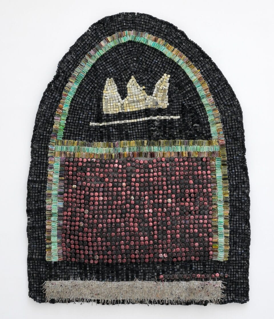 The artist’s current solo exhibition, The Crown! at Semiose, highlights the tension not only between visual harmony, consumer culture, and waste but also those of what curator Fernanda Brenner describes in the exhibition essay as “the tensions of Africa’s post-colonial afterlife.” Takadiwa describes it as the “colonial hangover.” For instance, afro combs appear throughout the show, “rooted in African traditions and the colonial self-fashioning they forced,” Brenner says. “Once tools for grooming and ritual, these combs now bear the weight of resistance and pride in Black political life.”