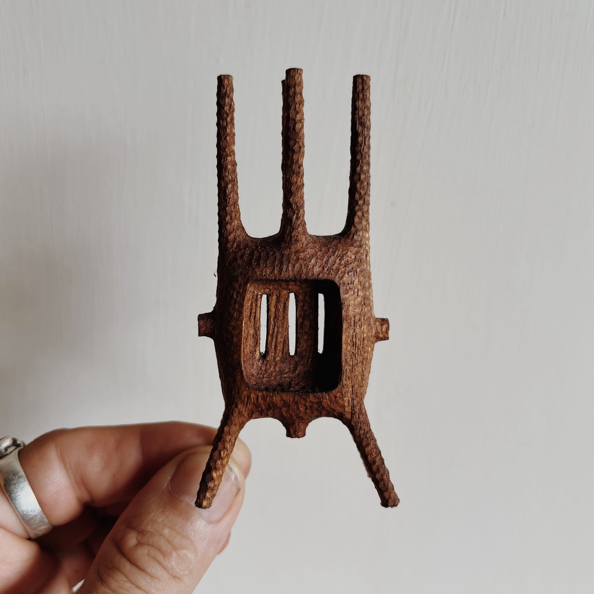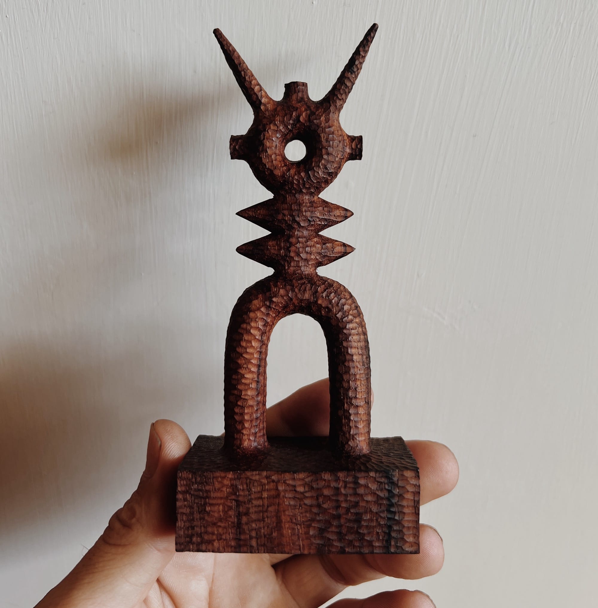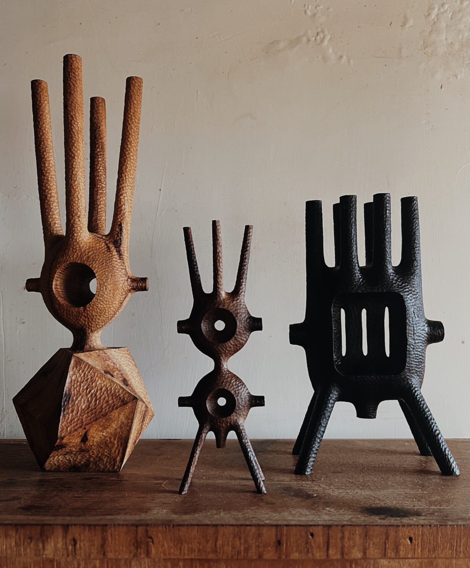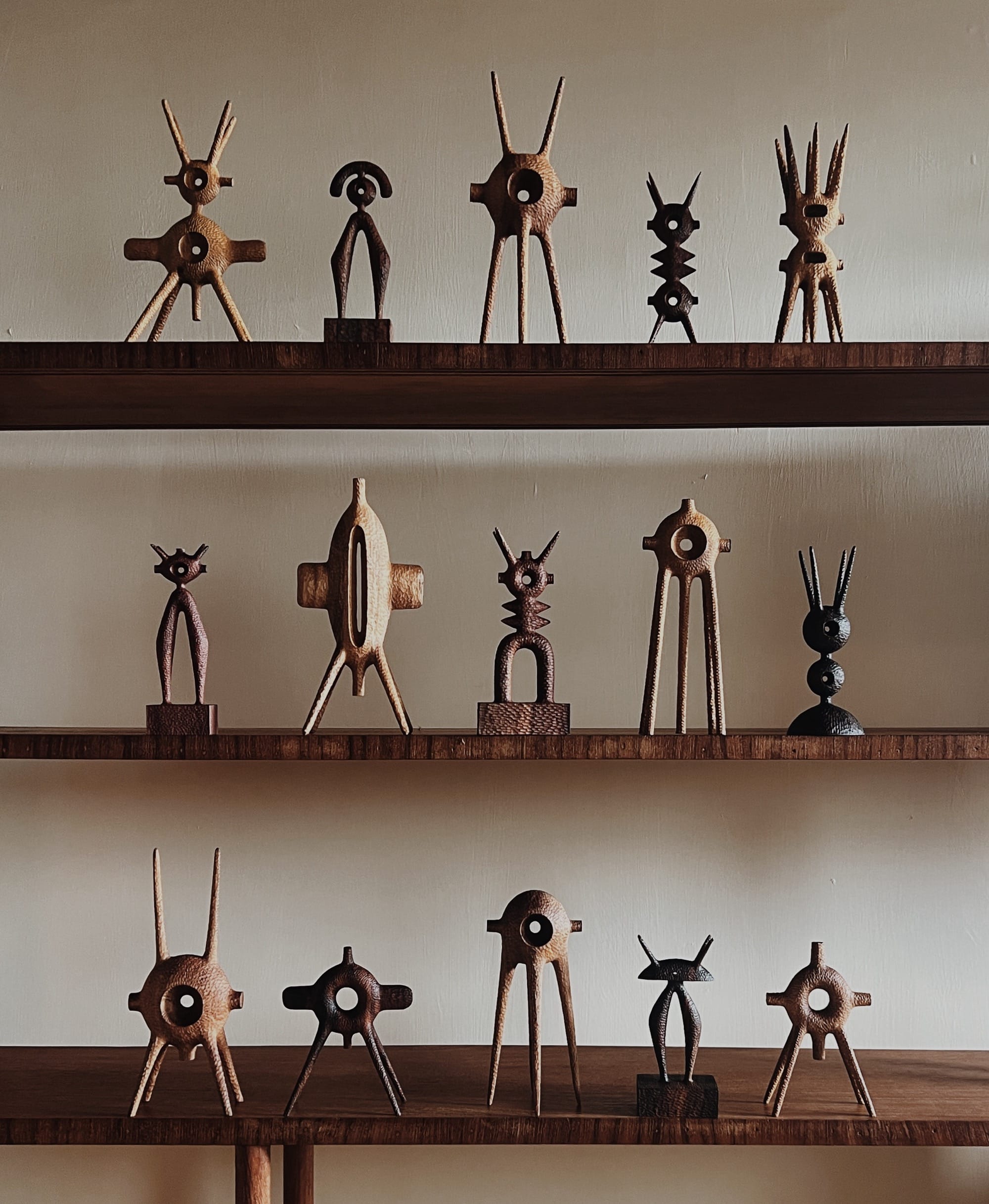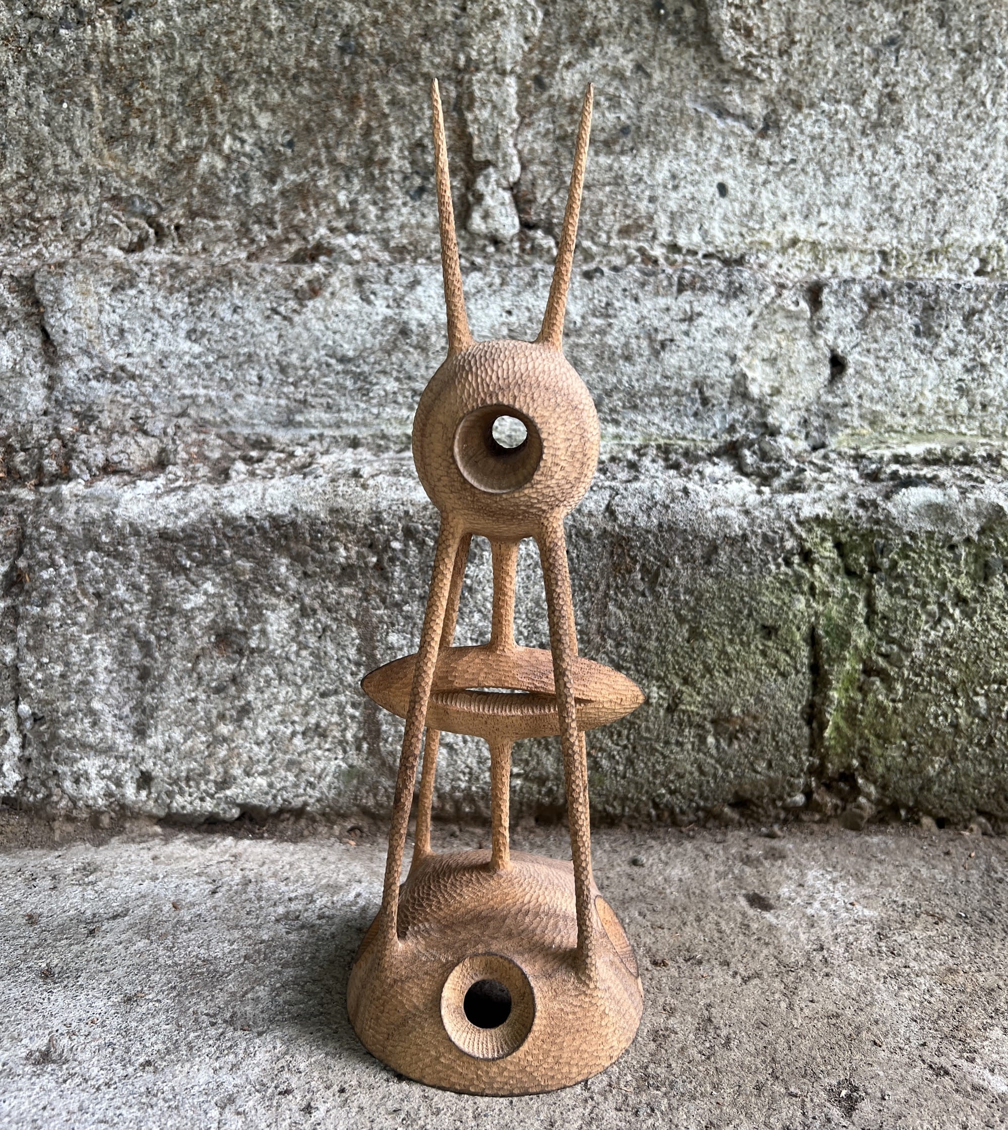 Chiseled from wood, Aleph Geddis’ spindly, playful, vaguely alien wooden sculptures evoke an enigmatic tension between identity and glyph. His organic, hand-worked objects teeter between abstraction and figuration like retrofuturistic icons. The artist lives between Japan, Bali, and Orcas Island in Washington. “This split has been incredibly generative, allowing me to carry my practice with me and respond to very different environments and energies,” he tells Colossal.