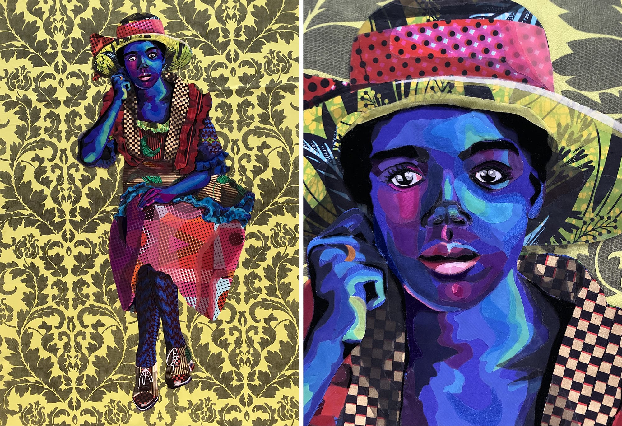 Bisa: Not so much a particular theme. Iโm letting it emerge based on the photos Iโm working with. Iโm very heavily reliant on vintage photographs. Sometimes I get in eras. This particular era is 1860 and World War One. My last series, all my pieces were based in World War II, except for one. My biggest piece from the last series was baseball players from 1899. That really spurred curiosity in me about what life was like for African-Americans pre-Civil War. Not just as enslaved people. When I find these photos of free people or people in school or in Europe, Iโm curious to know how they got there and what their life was like. It upends the story weโve all been told of what life was like for Black people at that time.