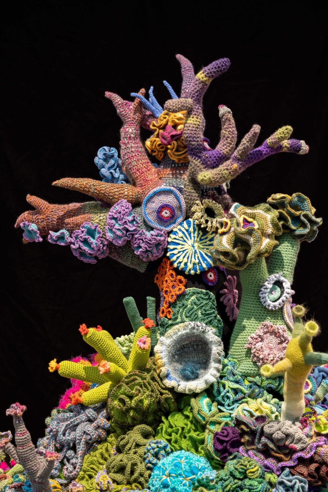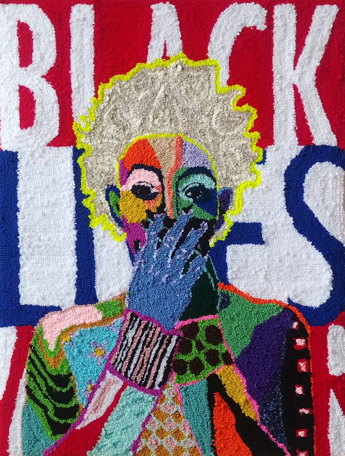 I didnโt quite get it until I went to grad school at Montclair State. Montclair State is a regular PWI (primarily white institution). Itโs a state school with a really strong fiber arts program formed by female professors in the โ70s. That was my first exposure to the feminist art ideals. At Howard, most of my professors were members of AfriCOBRA. Their aesthetic was Afrocentric, African-inspired artwork. At Montclair, the fibers program was really women-centered, โwomenโs work.โ That was really different for me. I hadnโt been in these studios with rooms full of yarn. It was there that I got the idea.
