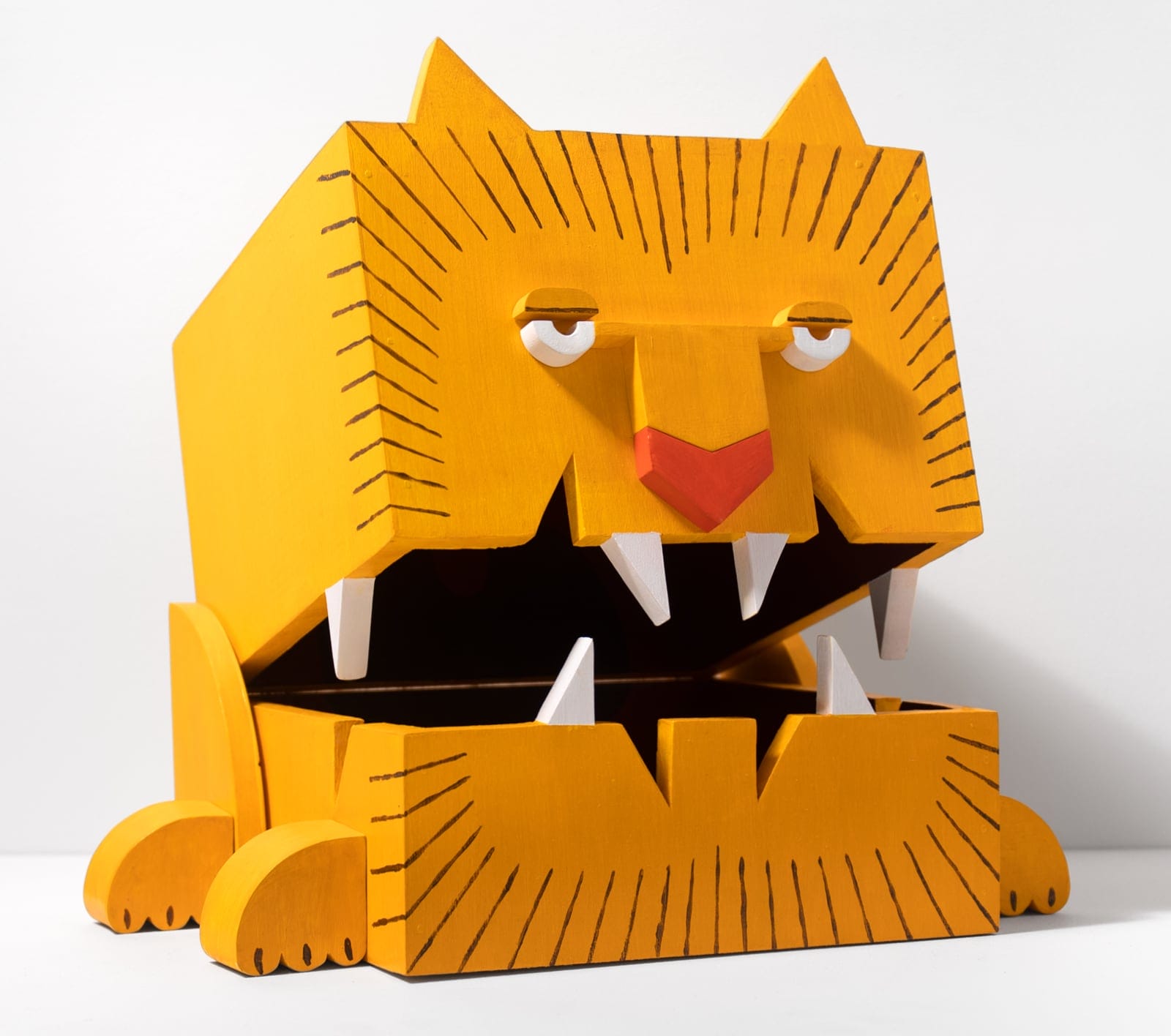 Sano’s distinctive woodcarving techniques are exemplary of the artist’s signature style. Dimpled surfaces, for instance, evoke different types of dog coats and allow for color variance to come through upon the finishing application of oil paint. Working with camphor wood, the sculptural exaggeration of physical features such as limbs, bulbous tufts of fur, and even nails add to the body of work’s playful appeal.