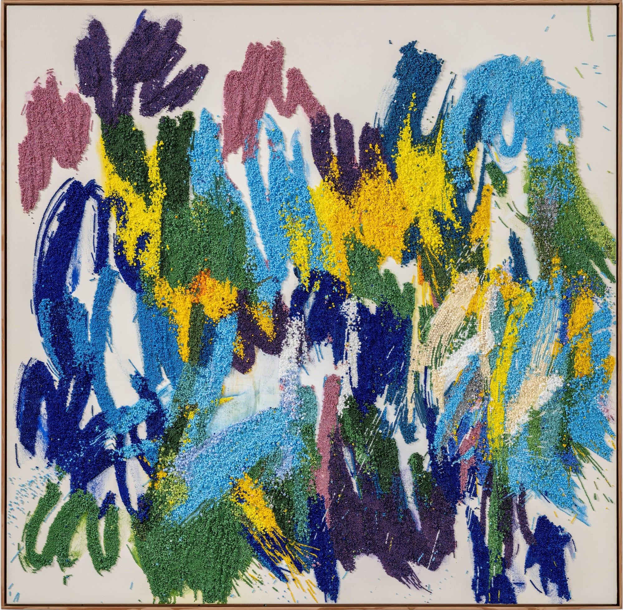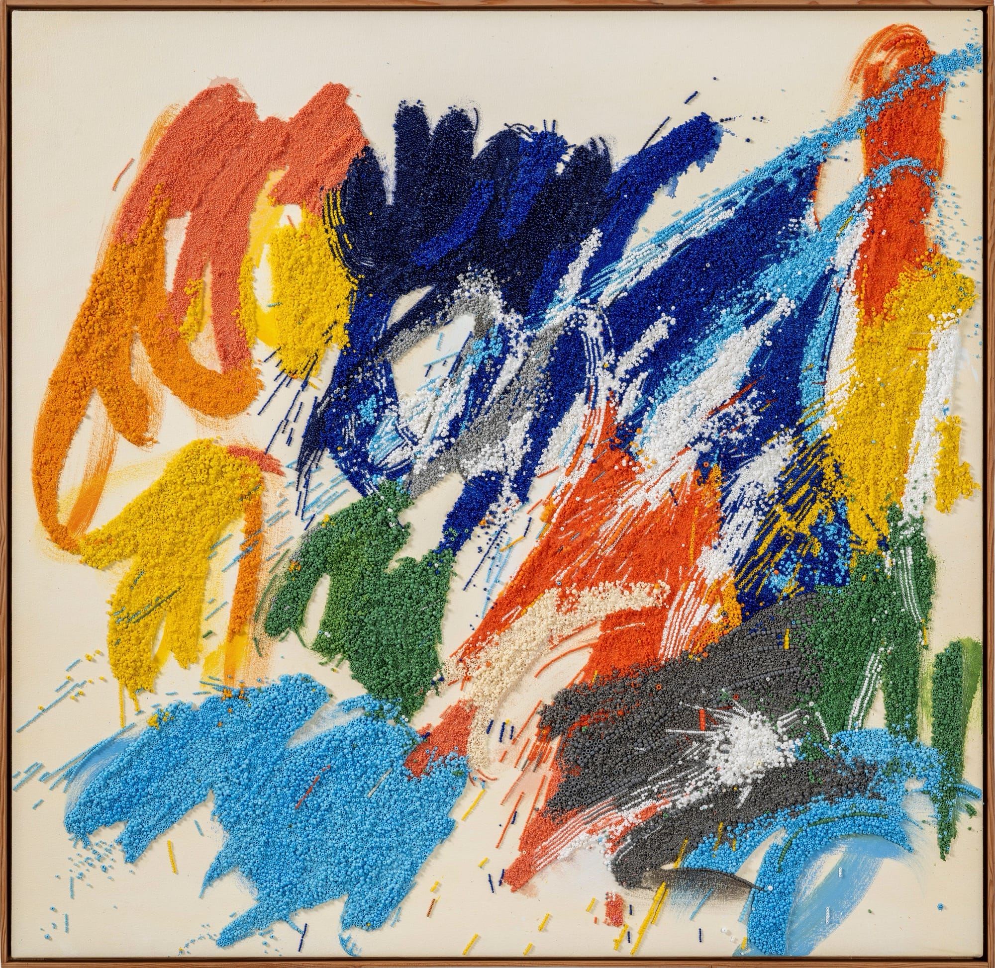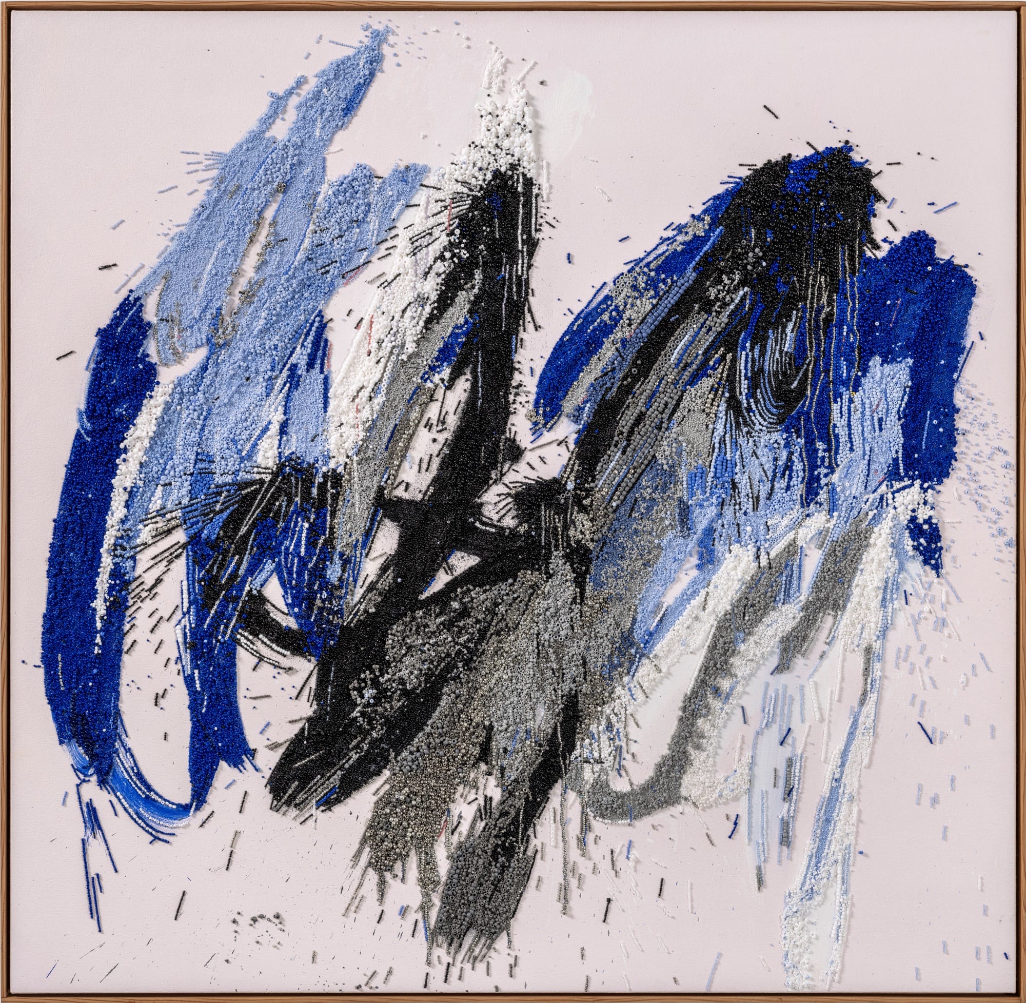 For artist Liza Lou, the calculation of brushstrokes, color, and gesture opens the door to another media type altogether—beads. The artist is known for using the material, including a large-scale installation titled “Kitchen,” which took five years to create. In her recent work, she adds thousands of the diminutive baubles in myriad colors, shapes, and sizes to sweeps of oil paint on canvas. Tapping into the legacy of Abstract Expressionism, Lou parses the relationship between gesture, intention, organic forms, and the brushstroke as a subject unto itself.